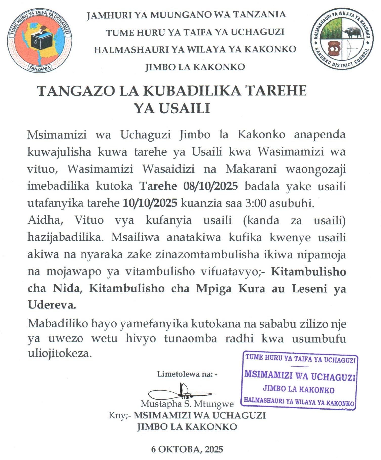 Msimamizi wa Uchaguzi Jimbo la Kakonko anapenda kuwajulisha kuwa tarehe ya Usaili kwa Wasimamizi wa Vituo, Wasimamizi wasaidizi na Makarani Waongozaji imebadilika kutoka tarehe 08/10/2025 badala yake usaili utafanyika tarehe 10/10/2025 kuanzia saa 3:00 asubuhi.